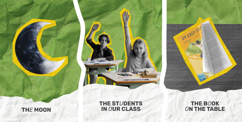 the Moon — Місяць; the students in our class — учні нашого класу; the book on the table — книга на столі.