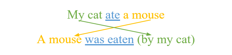 A mouse was eaten (by my cat). — Миша була з’їдена (моєю кішкою).