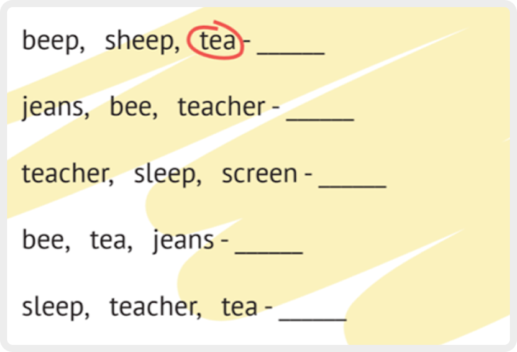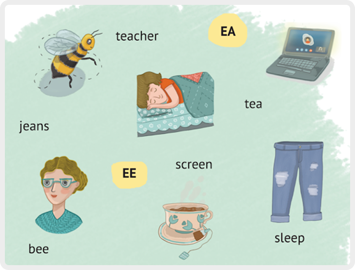 Здесь все еще работаем со звуками EA и EE, но делаем задачу немного сложнее: теперь нужно вспомнить, в каком слове использовать EA а в каком EE. Хорошее упражнение на память. Скорее всего, учащиеся будут «проговаривать» эти слова у себя в голове, чтобы определить, какому именно звуку где место. Это хорошая практика.