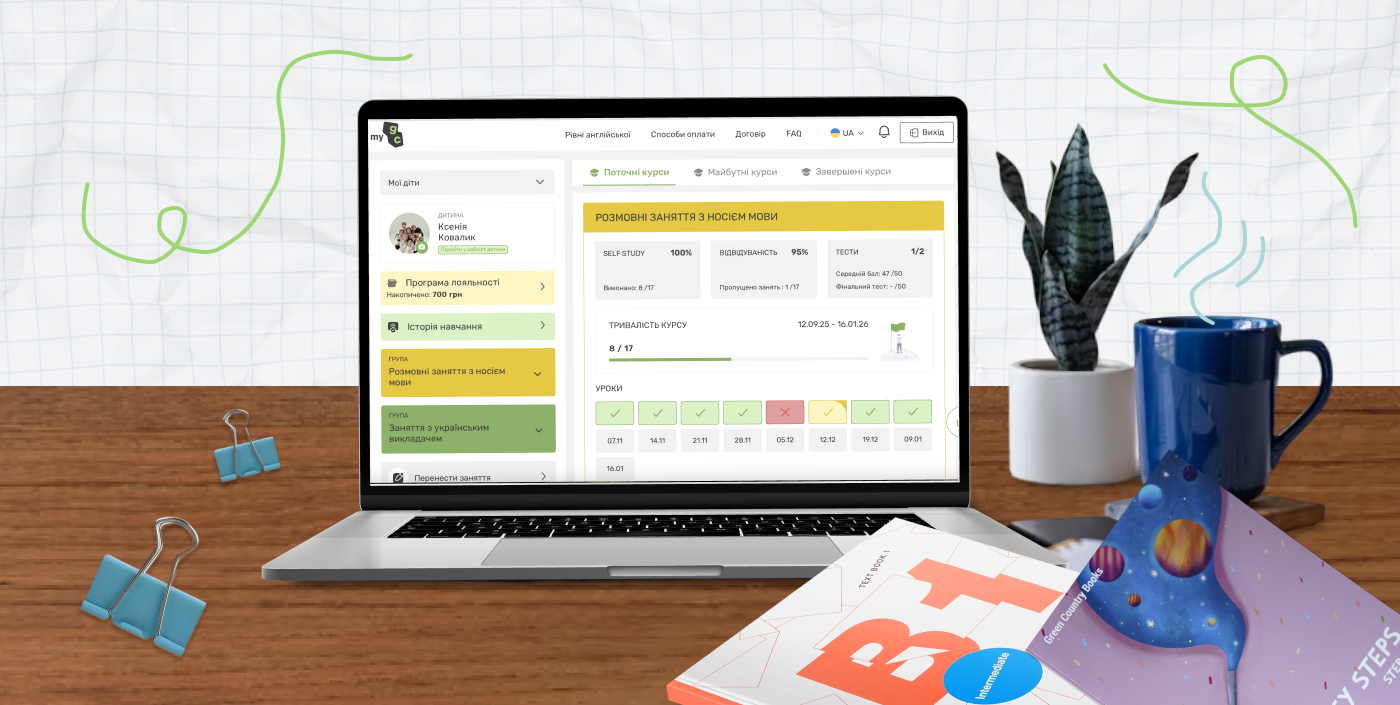 Если ребёнок проходит несколько курсов параллельно или его курс включает разные типы занятий — например, разговорные с носителем языка и общие с украинским преподавателем, — информация о каждом из них отображается отдельно, чтобы было удобно ориентироваться в расписании и важных данных.